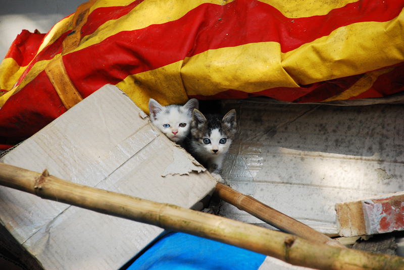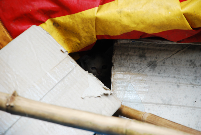直到這隻幼幼虎斑正從帆布袋上急忙溜進他的窩我才注意到他