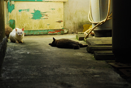 躲到巷子裡的白屁股跟一隻胖虎斑