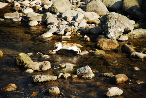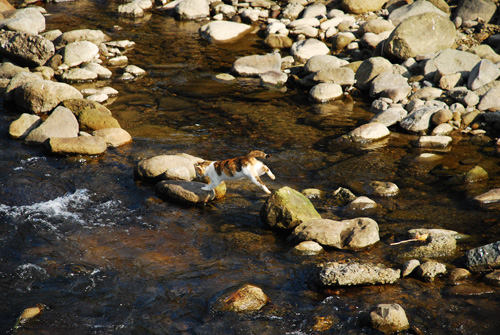 三花很自在的在溪上石頭跳來跳去