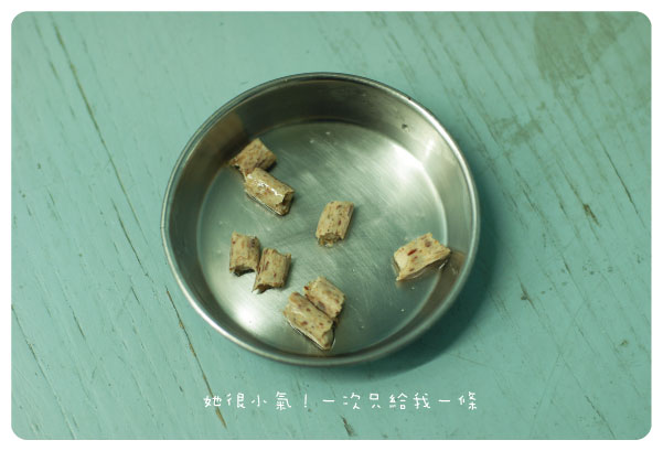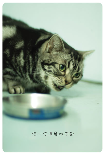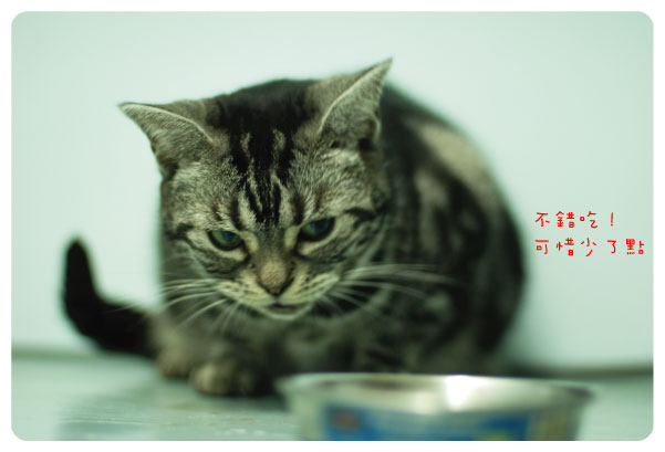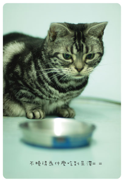 買貓砂時看見這項新產品,本想一次把3.4種口味買齊但後來想到家裡零食還是很多就通通放回企了XD這商品沒有中文名,連Logo都沒有當時買沒注意以為是CIAO的產品應該看的出來她吃的很努力= =她就這樣呆看著碗大概10秒...........(碗裡還有歐) 妳跟娘一樣有老人癡呆嗎